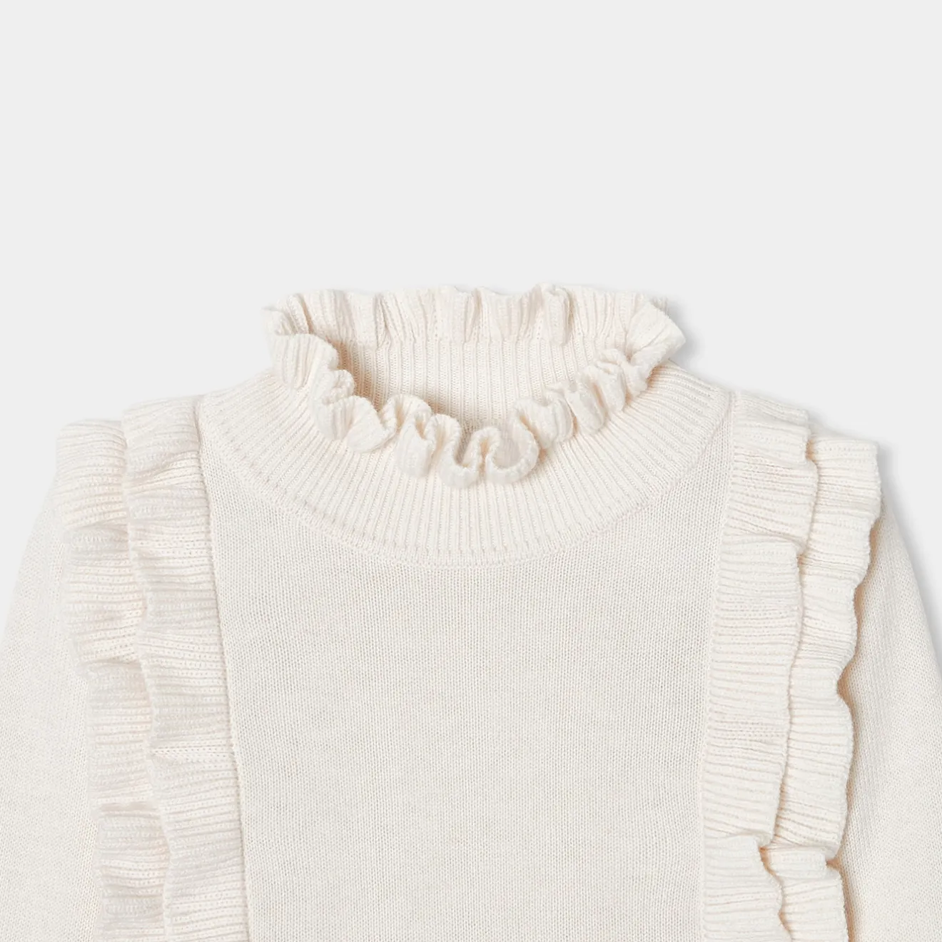 – Col montant, empiècements et bas de manches volantés