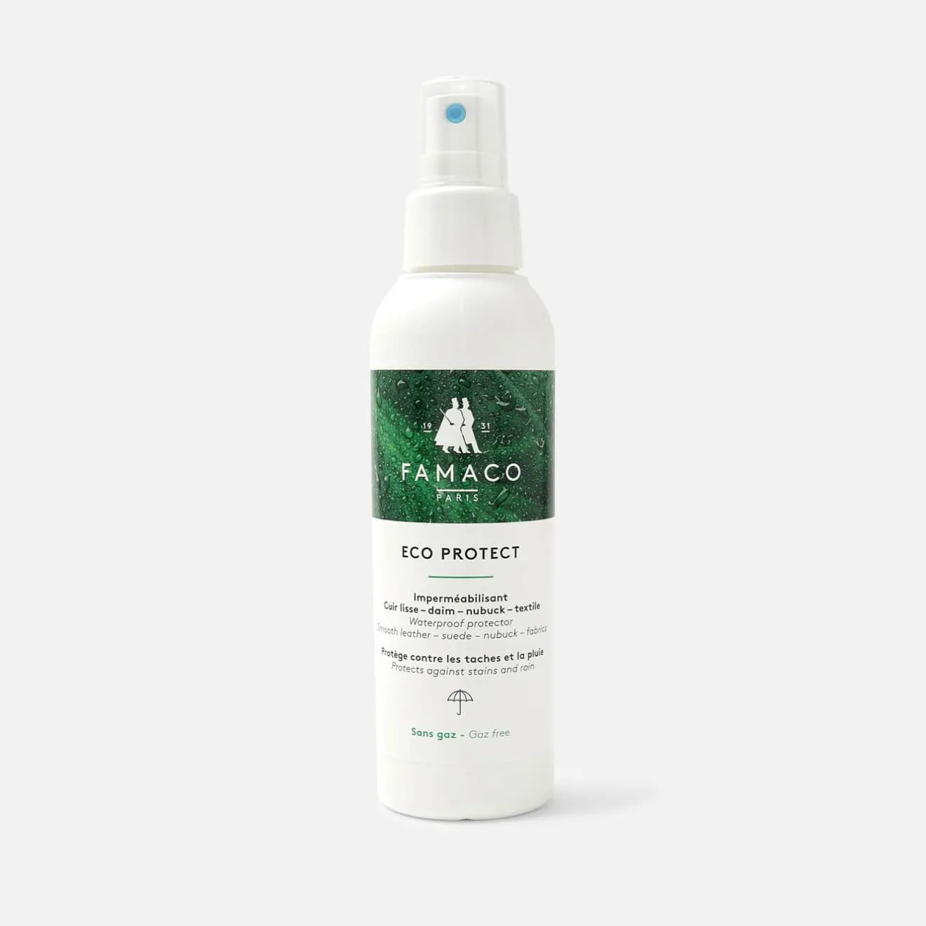 Après dépoussiérage de la chaussure à l’aide d’une brosse Famaco, vaporiser la chaussure à 10-15 cm de hauteur. Laissez sécher pendant au moins 30 minutes avant d’exposer les chaussures à l’eau. Pour un meilleur résultat, répéter l’opération régulièrement. Faire un essai sur une partie cachée.